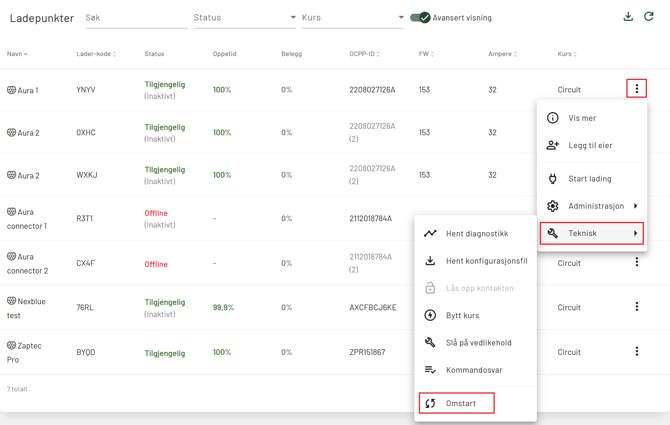 Husk at omstart ikke fungerer om et ladepunkt er offline.