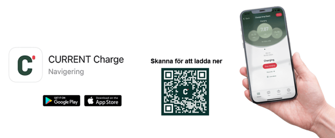 - Vi rekommenderar att du laddar ner CURRENTs mobilapp – den heter CURRENT Charge (tidigare kallad SmartCharge) och finns tillgänglig i Google Play eller App Store.