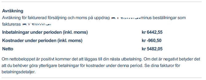 Om de insamlade betalningarna (faktiskt betalda fakturor från kunderna) är mer än kostnaderna för den senaste månaden är saldot positivt och en betalning kommer att göras. Om saldot är negativt, och fakturan måste betalas.